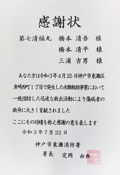 本船(第7清福丸)が、近くで溺れていた女性を救助し神戸市東灘消防署より感謝状を頂きました。