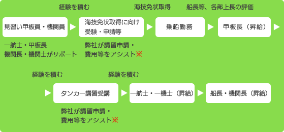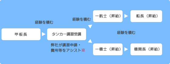 一人当直可能船員の方が乗船勤務される場合は、タンカー経験者とともに乗船し、短期間でタンカーにも乗ることができるダブル乗船の資格取得が可能です。
